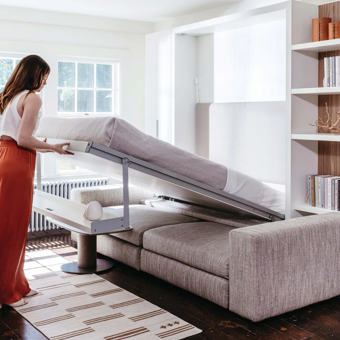 - تختهای تاشو افقی: این مدلها بهصورت افقی جمع میشوند و برای اتاقهایی با سقف کوتاه یا دیوارهای عریض مناسباند. این نوع تختها بهویژه در فضاهایی که عرض بیشتری دارند، کاربردی هستند.