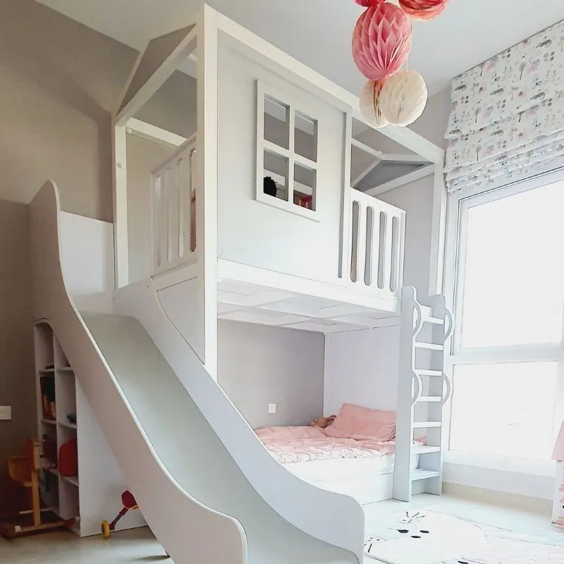 تخت دو طبقه با سرسره، یکی از مدل‌های بسیار جذاب و پرطرفدار برای اتاق‌های کودکان است. در این مدل، به جای پله‌های معمولی، از یک سرسره برای دسترسی به تخت بالا استفاده می‌شود. این ویژگی به‌ویژه برای کودکان کوچک بسیار هیجان‌انگیز است و آن‌ها می‌توانند با بازی و سرگرمی از تخت پایین به تخت بالا بروند. علاوه بر این فضای زیر تخت نیز می‌تواند برای بازی و سرگرمی کودکان به‌کار رود این نوع تخت نه تنها کاربردی است، بلکه با طراحی‌های شاد و رنگارنگ، اتاق کودک را به فضایی جذاب و دلنشین تبدیل می‌کند.