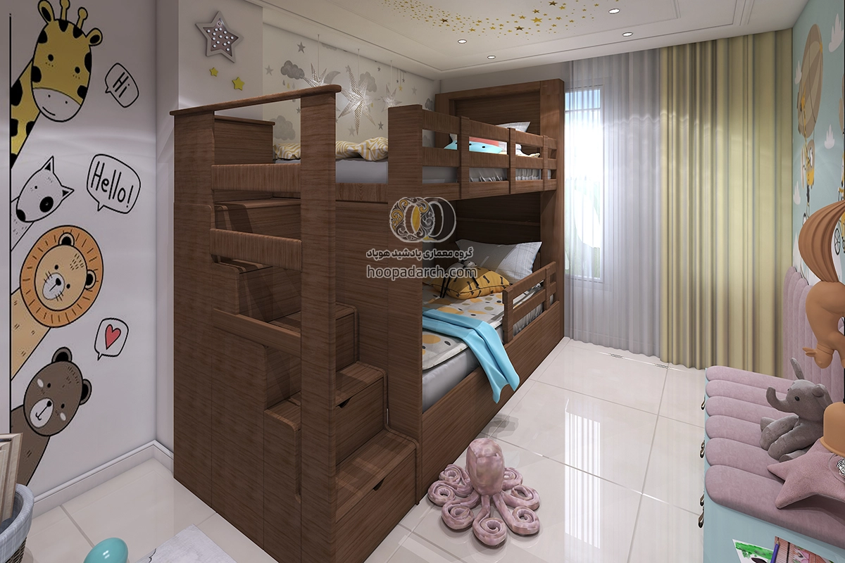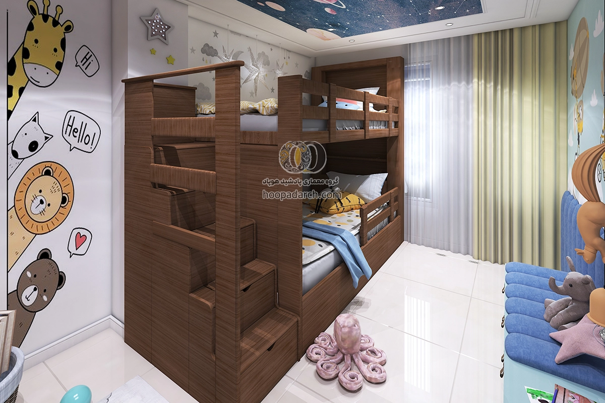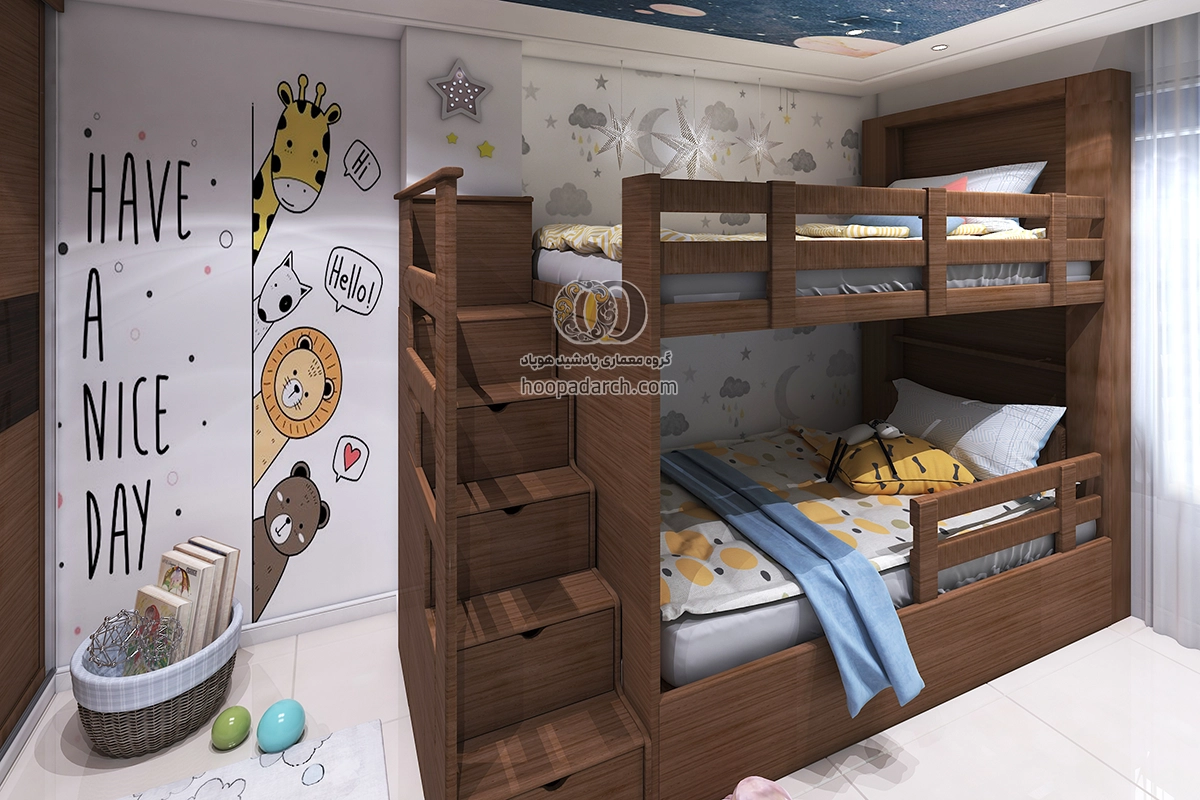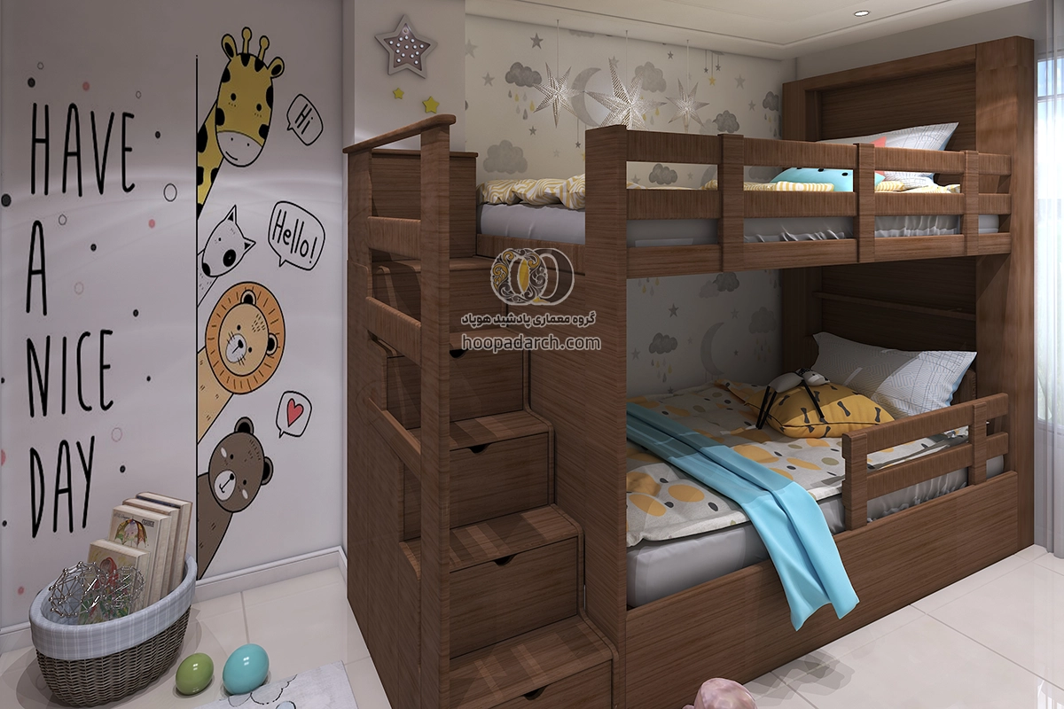 اگر تخت دو طبقه برای اتاق کودک است می‌توانید از رنگ‌ها و طرح‌های فانتزی برای روتختی و پرده‌ها استفاده کنید. برای اتاق نوجوانان انتخاب لوازم جانبی مدرن‌تر و ساده‌تر مانند وسایل ورزشی، کاغذ دیواری های طرح دار و نصب تلوزیون دیواری برای بازی های رایانه ای می‌تواند فضای شیک‌تری ایجاد کند. نورپردازی نیز نقش مهمی در زیبایی اتاق دارد نصب چراغ‌های دکوری یا نوارهای LED زیر تخت می‌تواند جلوه زیبایی به فضا بدهد و به آن انرژی بیشتری ببخشد برای گرفتن ایده میتوانید علاوه بر جست و جو سایت هایی مثل پینترست و سایت های دکوراسیون داخلی ارسال طرح دلخواه خودتون برای ما، نمونه کارهای انجام شده توسط هوپاد را هم بررسی کنید. برای مشاوره رایگان و راهنمایی شما منتظر تماس تون هستیم.