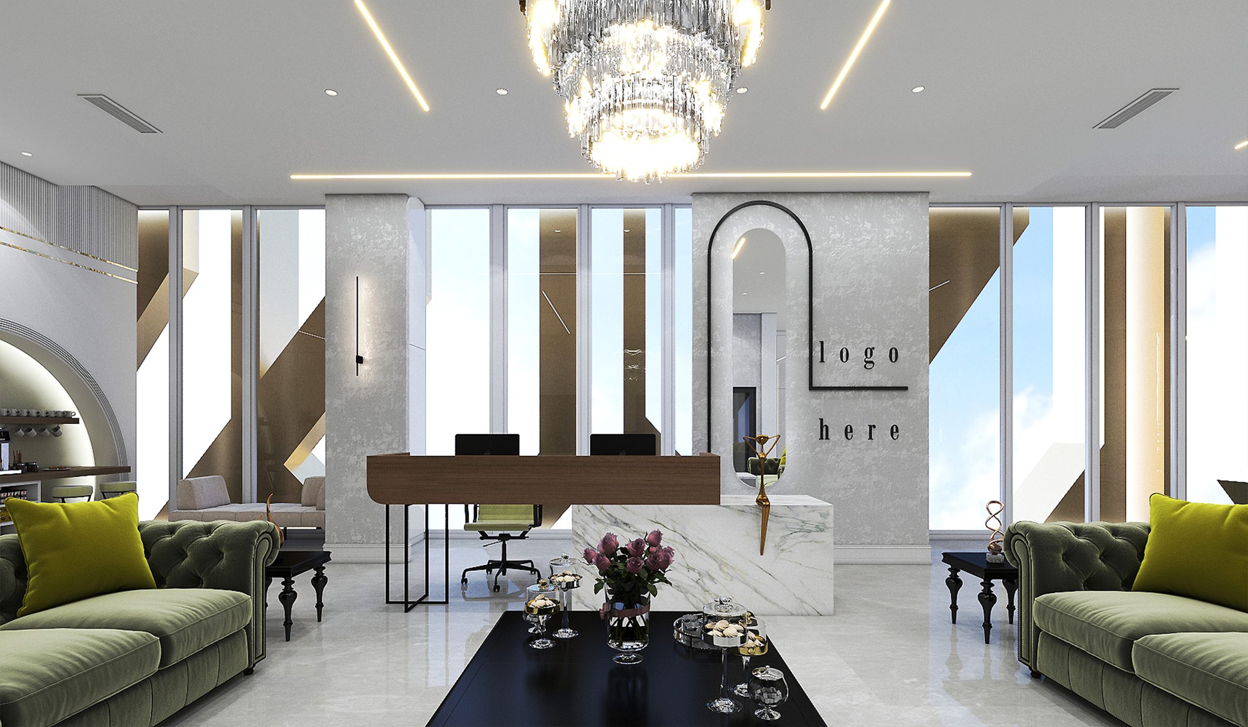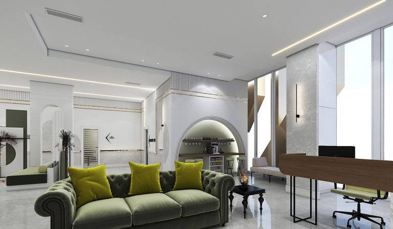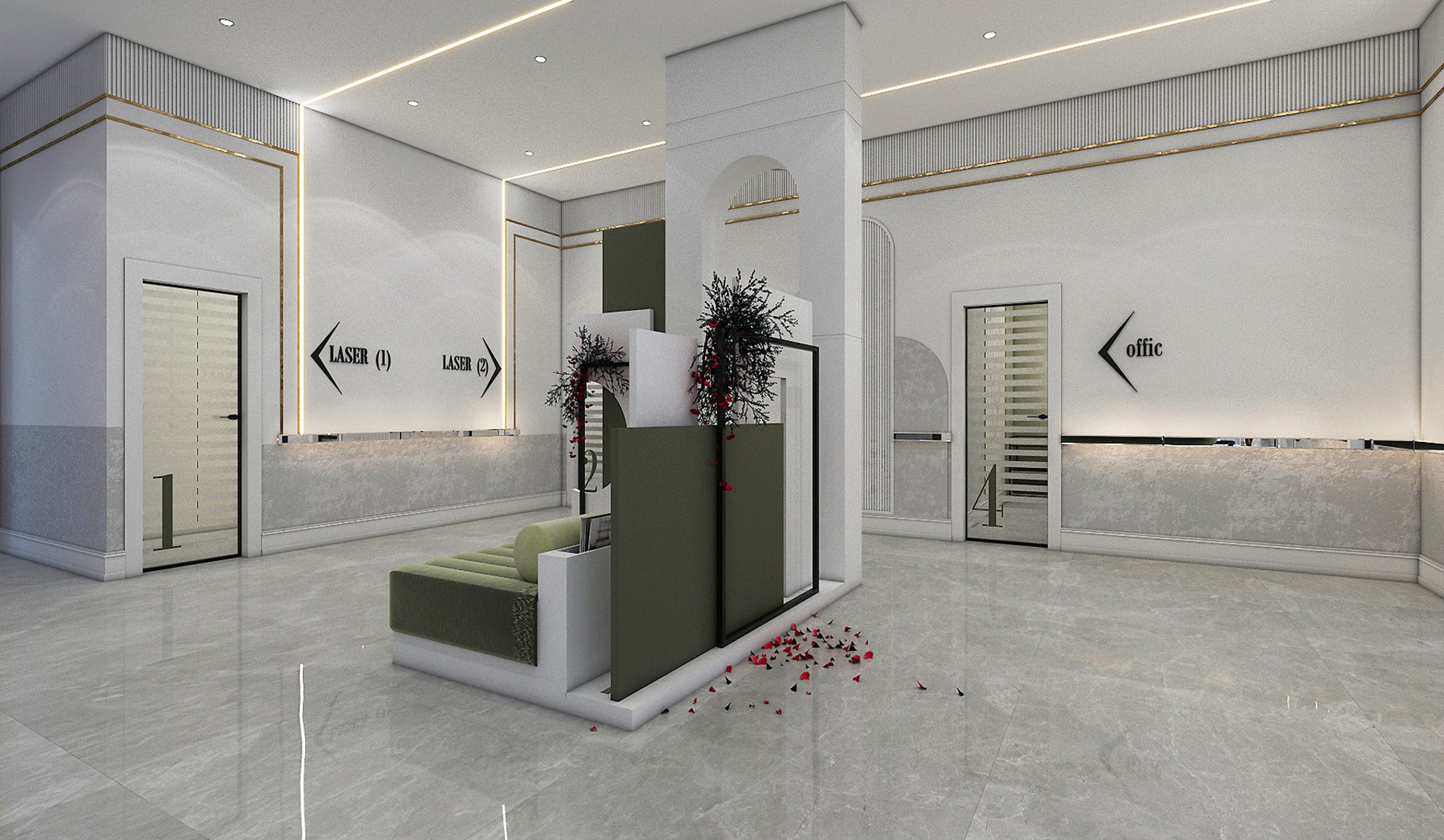 This image showcases the modern and stylish interior of a beauty clinic named CYRA Beauty Clinic. Its minimalist design, utilizing neutral colors and gold accents, creates a luxurious and welcoming atmosphere. Overall, this design is both luxurious, minimal, and inviting—perfectly suited for a beauty clinic.The interior design of this clinic, in terms of composition and choice of elements, is carefully crafted to evoke a sense of luxury, minimalism, and hospitality. Considering your design projects, this style can serve as great inspiration for reception areas, entrances to luxury salons, and cozy, relaxing sections Strategically placing the clinic’s name and logo enhances brand identity and conveys a professional impression to clients. Creating an inviting space: A combination of warm lighting, comfortable furniture, and soothing colors makes the environment pleasant and reassuring for visitors