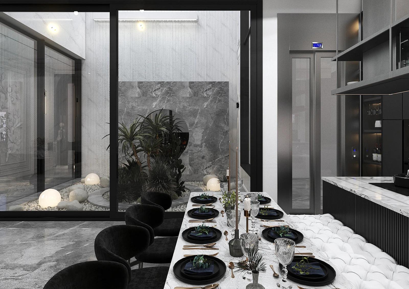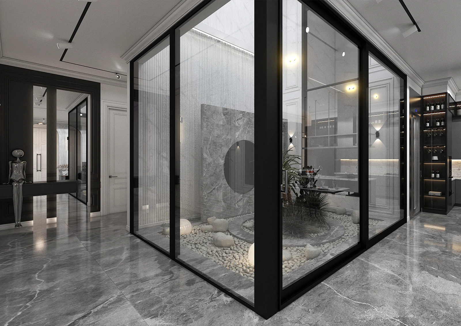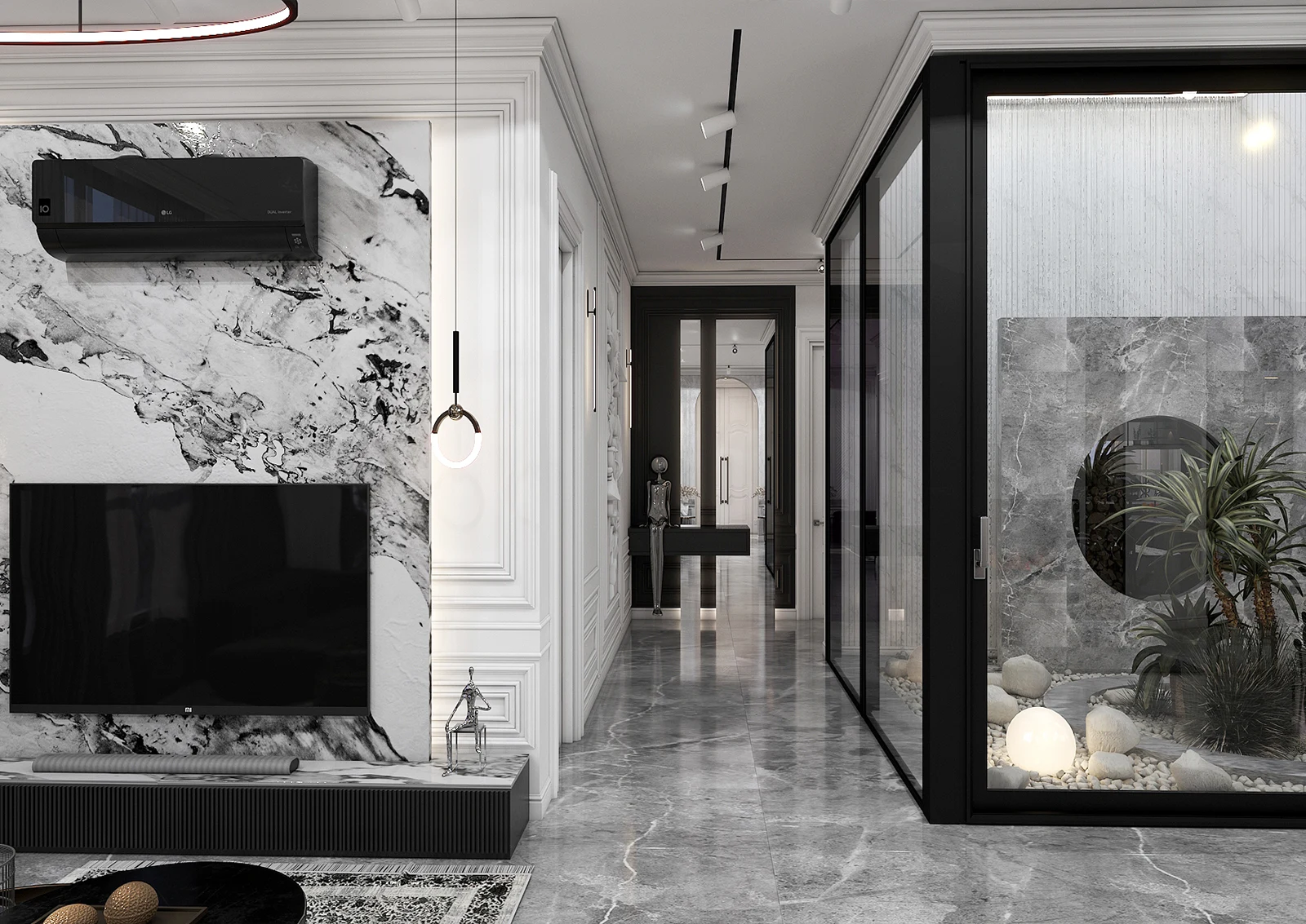 A marble wall with natural veins houses a black TV, unassuming but powerful. A minimalist pendant light from the ceiling, like a painter’s focal point, controls the space. At the end of the hallway, an indoor garden with stones, white sand and tropical plants breathes like a peaceful haven in the heart of modern architecture. A circular mirror reflects the image of nature, not to be seen, but to be felt.A marble wall with natural veins houses a black TV, unassuming but powerful. A minimalist pendant light from the ceiling, like a painter’s focal point, controls the space. At the end of the hallway, an indoor garden with stones, white sand and tropical plants breathes like a peaceful haven in the heart of modern architecture. A circular mirror reflects the image of nature, not to be seen, but to be felt.