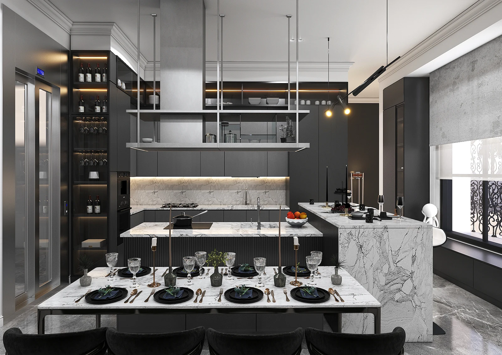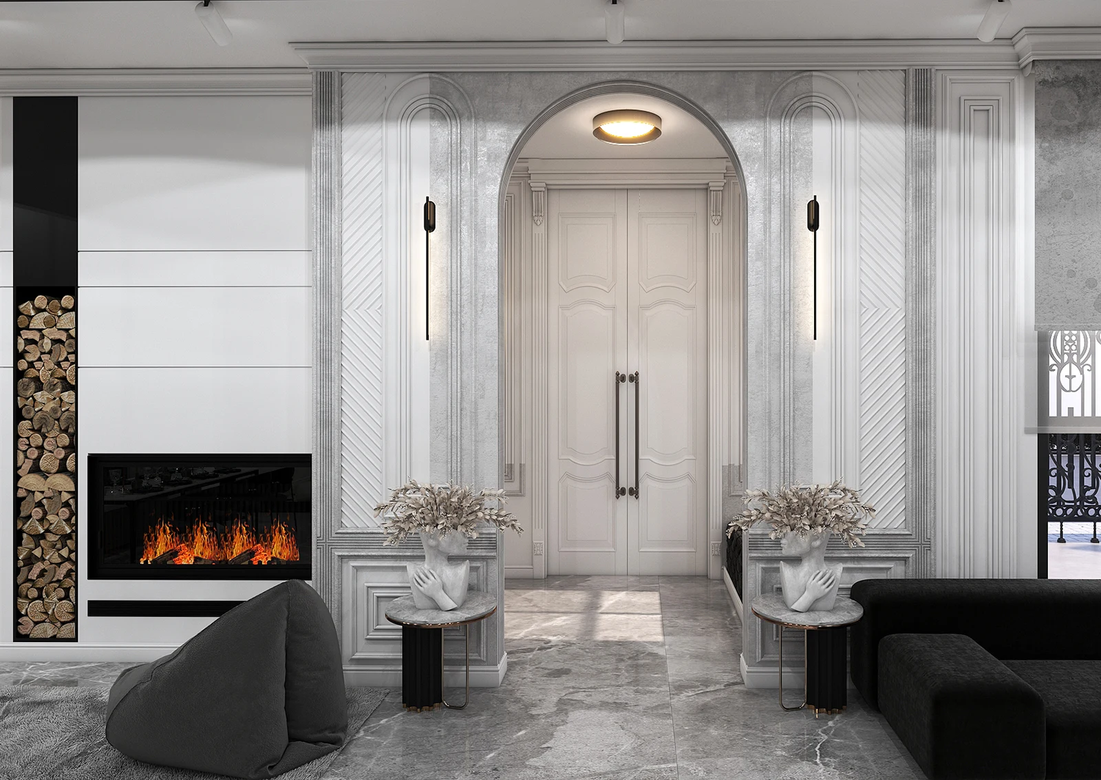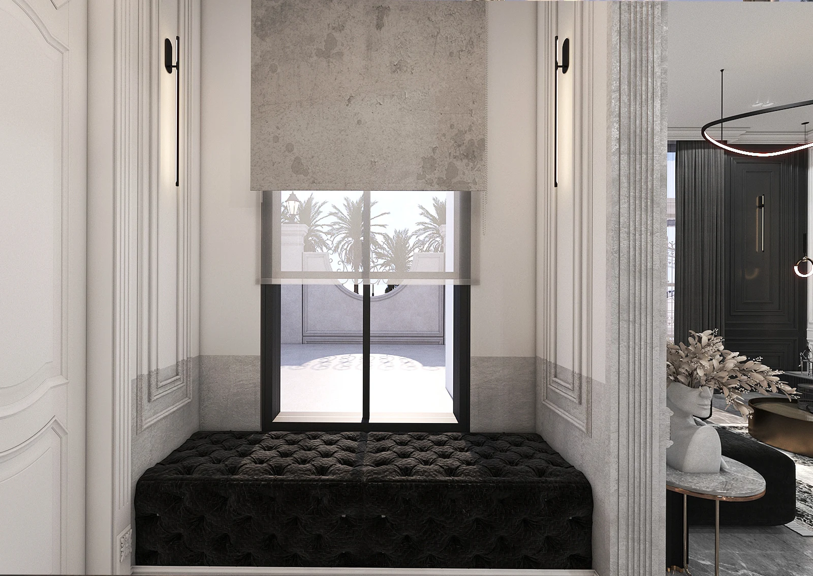 The soft sound of your shoes on the gray marble echoes in the silence of the space like a soft whisper. The wall light on either side of the arched white doors, like two silent musicians, guides you forward. The frames, the stucco, all with a classical precision and modern dignity, remind you of Parisian architecture but with a contemporary spirit.
