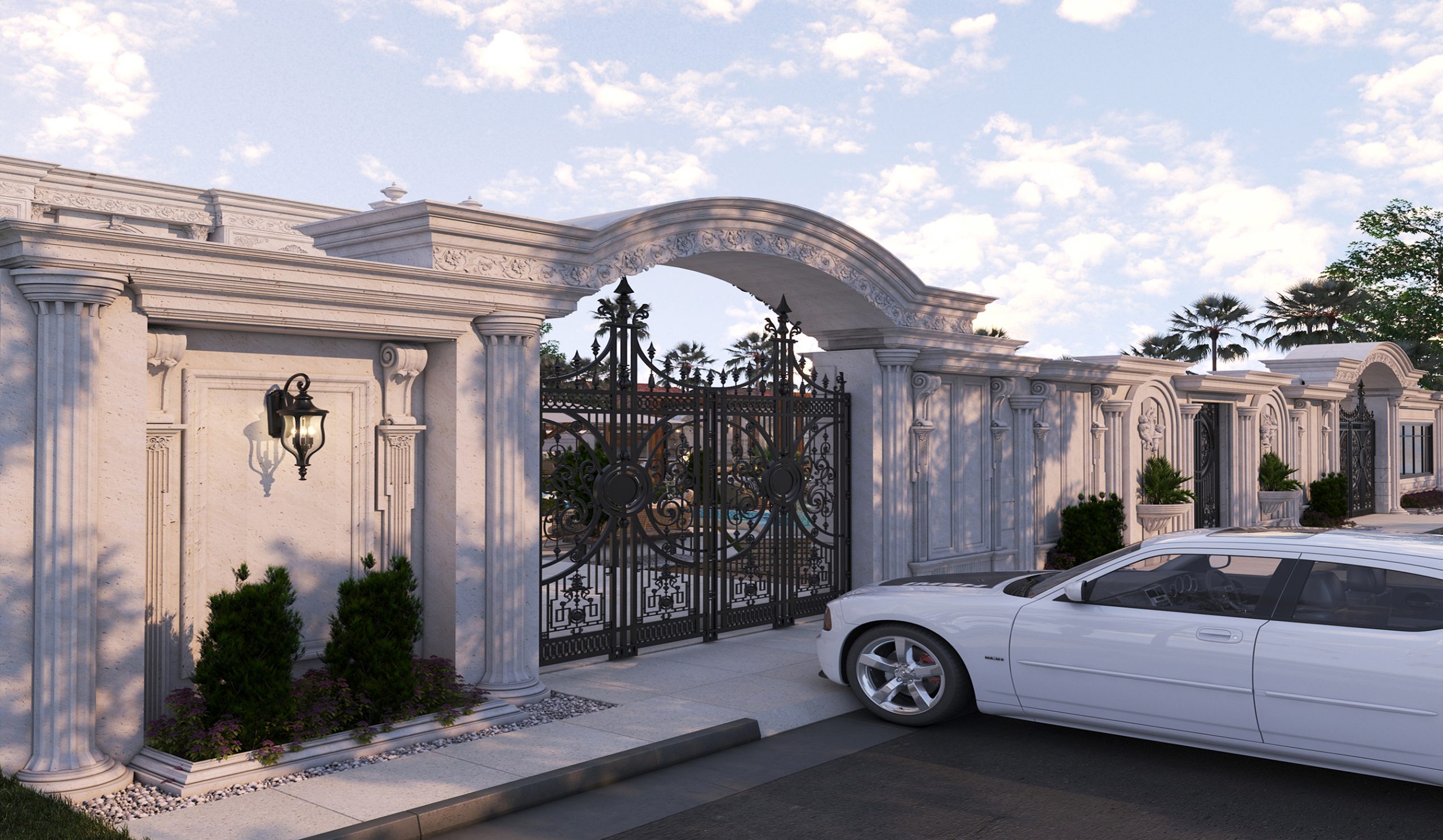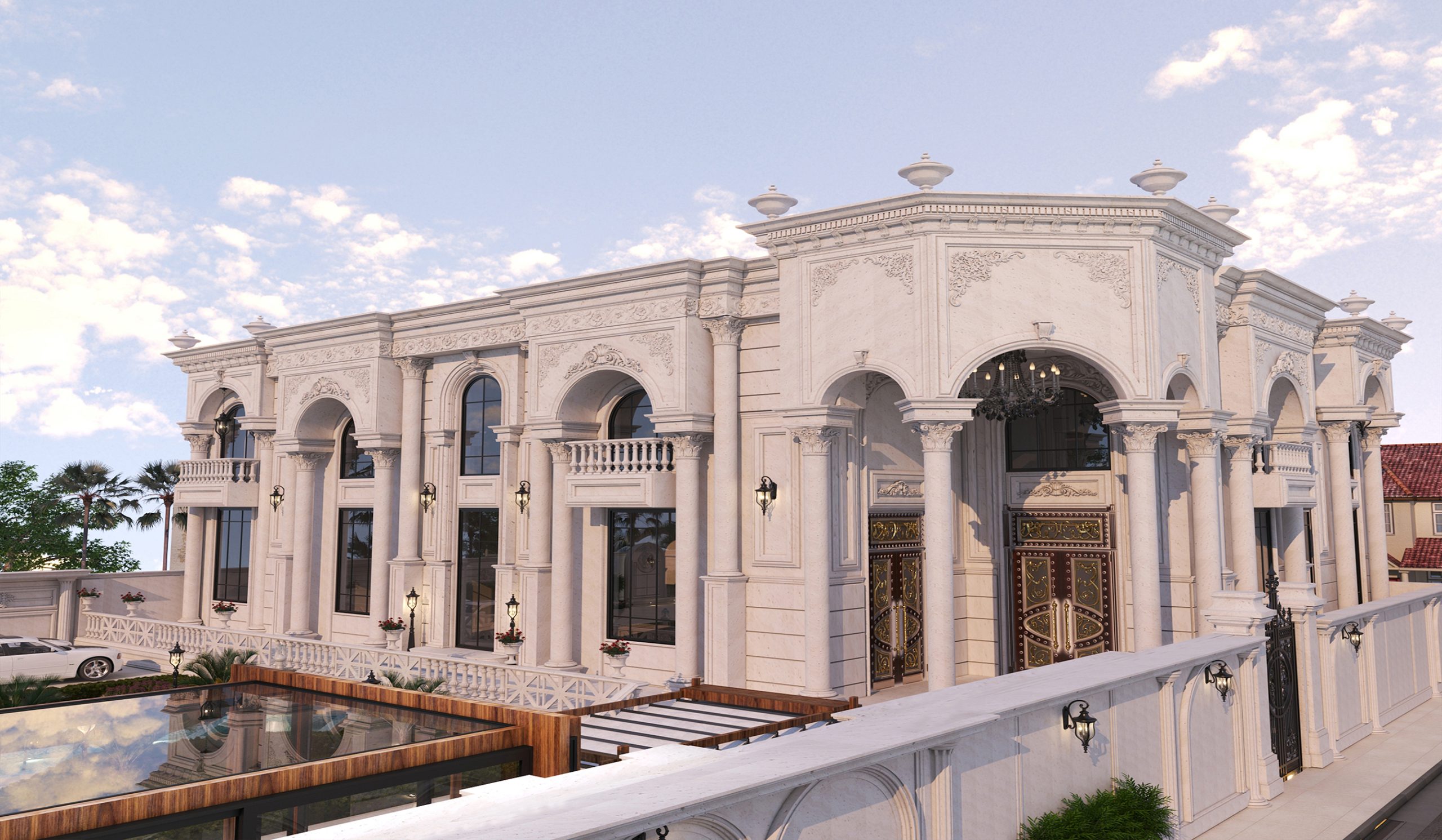 This image showcases the facade of a very luxurious and classical villa, designed in the Neoclassical or Late Renaissance style, inspired by European architecture. Tall columns with Corinthian capitals, semi-circular arches, and intricate stone decorations are key features of this style. The white stone or cement facade gives the building a clean and majestic appearance. The main entrance is located on the right side of the image, featuring a grand staircase and a large golden-brown door with a classical design. The entrance ceiling is adorned with tall columns and striking decorations. This image portrays a highly elegant European-style mansion where architectural symmetry, proportional decorative elements, high-quality materials, and meticulous landscaping all contribute to an overwhelming sense of grandeur and sophistication.