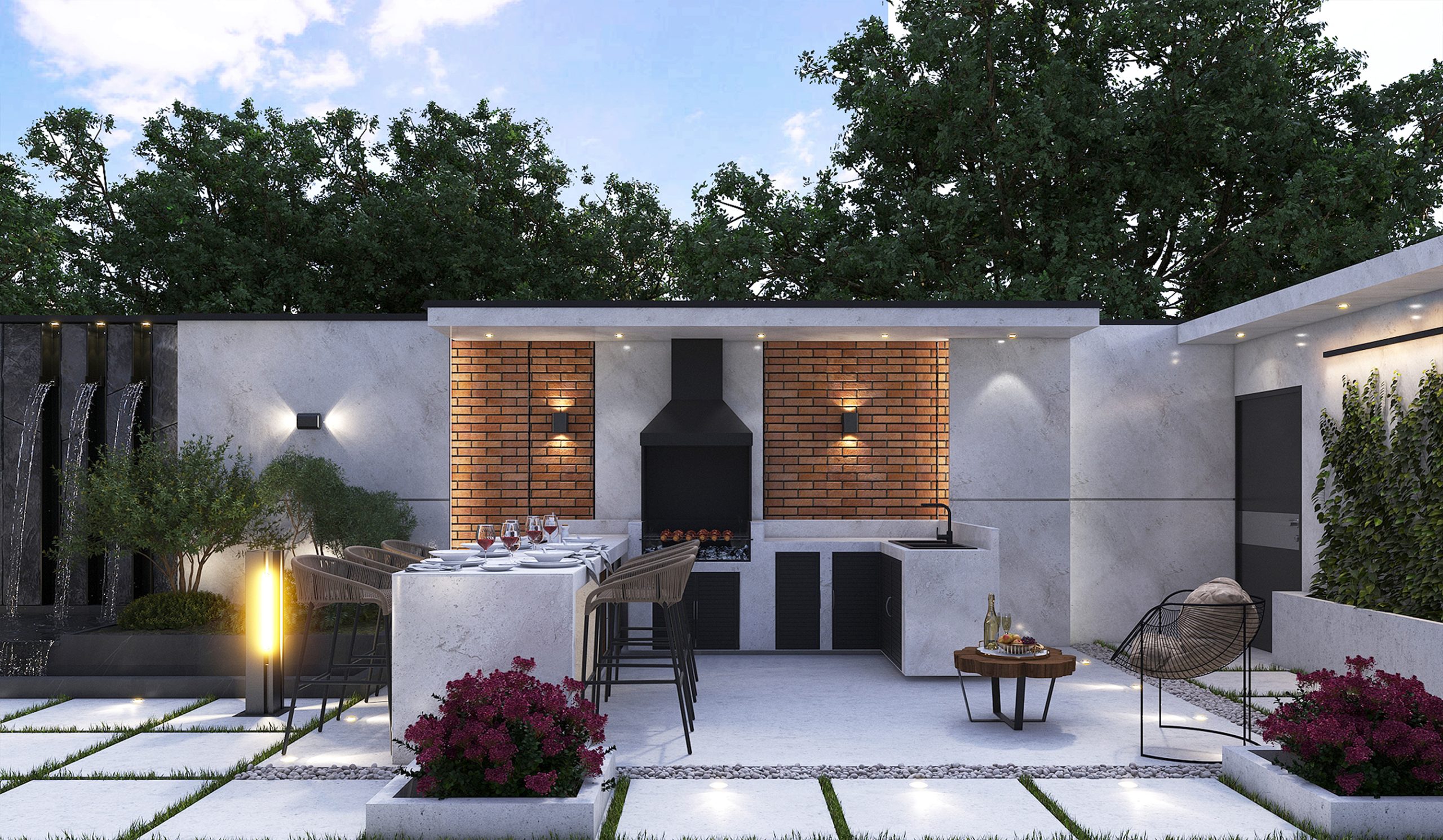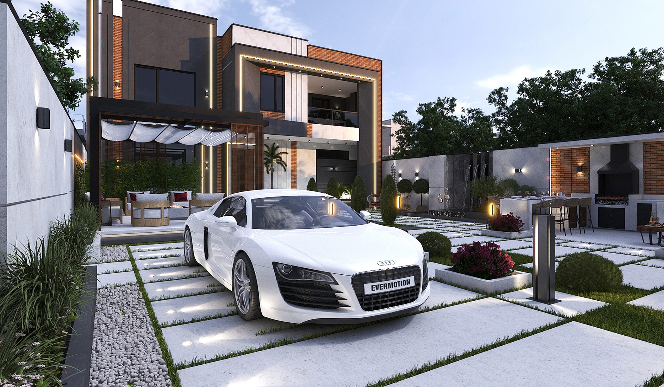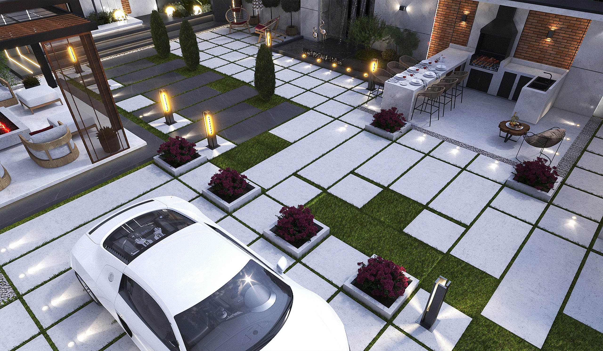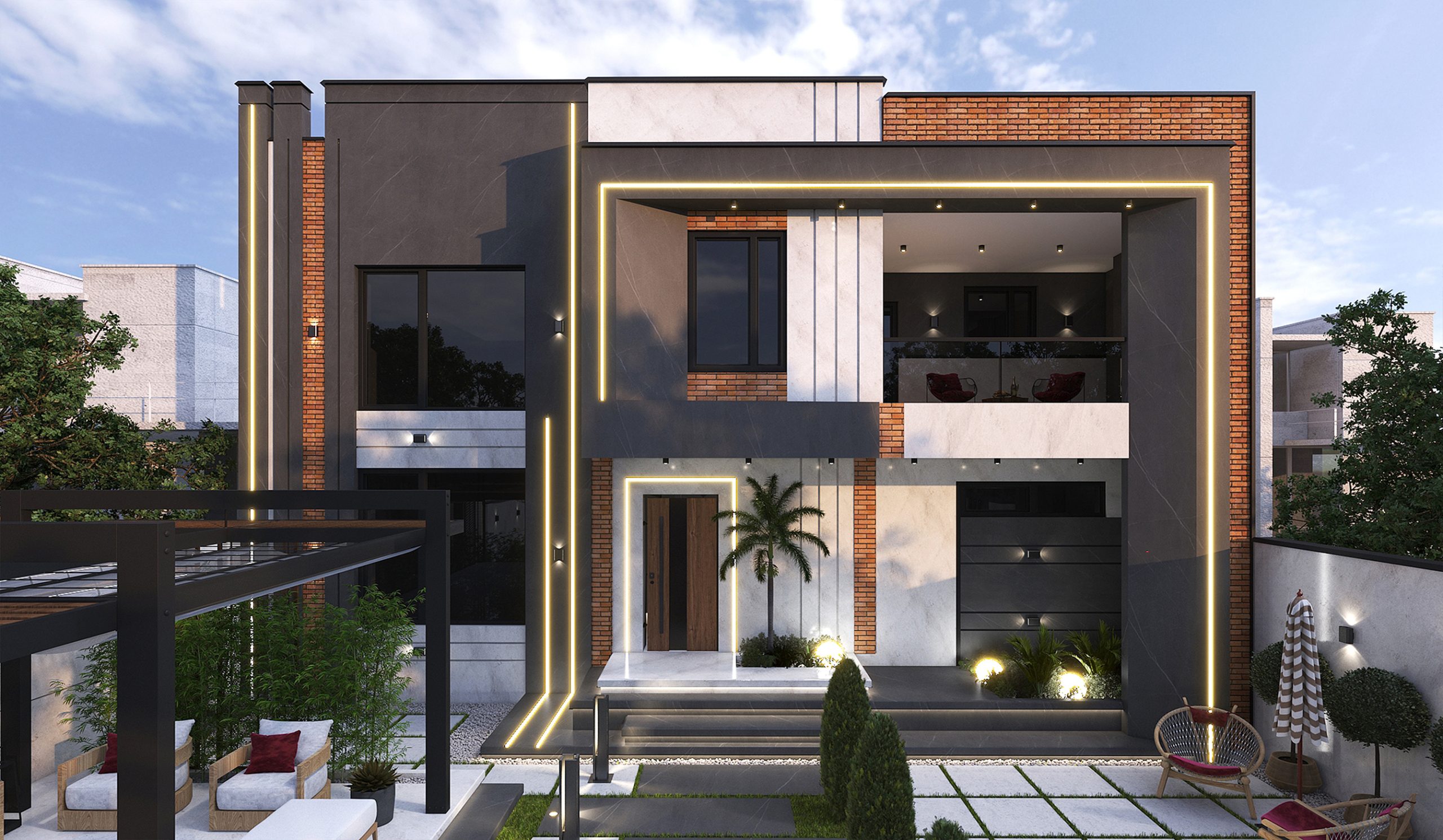 This modern building with a contemporary design incorporates high-quality materials such as wood, concrete, and glass in its façade. The precise geometric combination alongside large windows gives the space an open and bright appearance. Clean and simple lines in the façade design create a sense of minimalism and grandeur simultaneously.The entrance of the house features a large black gate with horizontal grooves, enhancing privacy and security. The number ’51’ displayed on the side panel adds a unique and distinctive identity to the building.Smart lighting with concealed fixtures and LED strips highlights the lines and edges of the structure, giving the façade a striking look.Natural elements are also well-integrated into the design, with plants placed in front of the building and on balconies, reinforcing a sense of freshness and harmony with nature.This combination of modern materials and natural elements creates a warm yet stylish and luxurious atmosphere.
