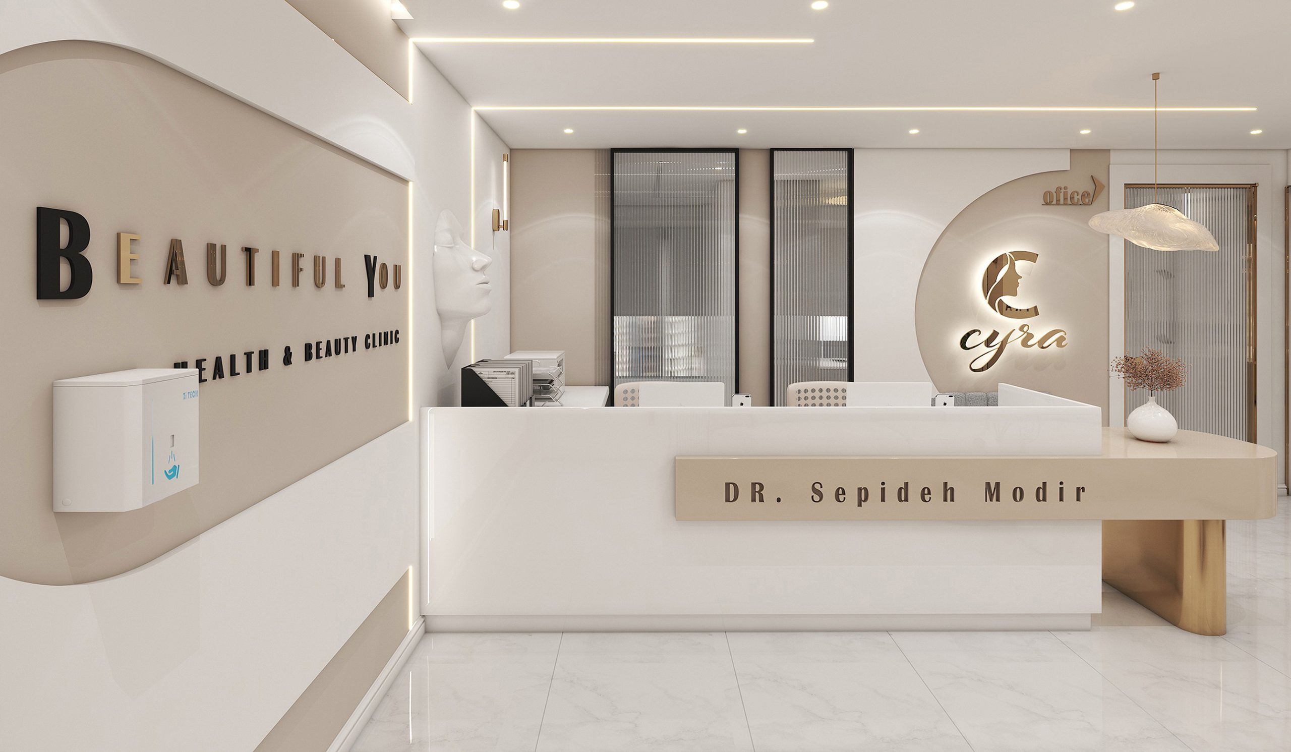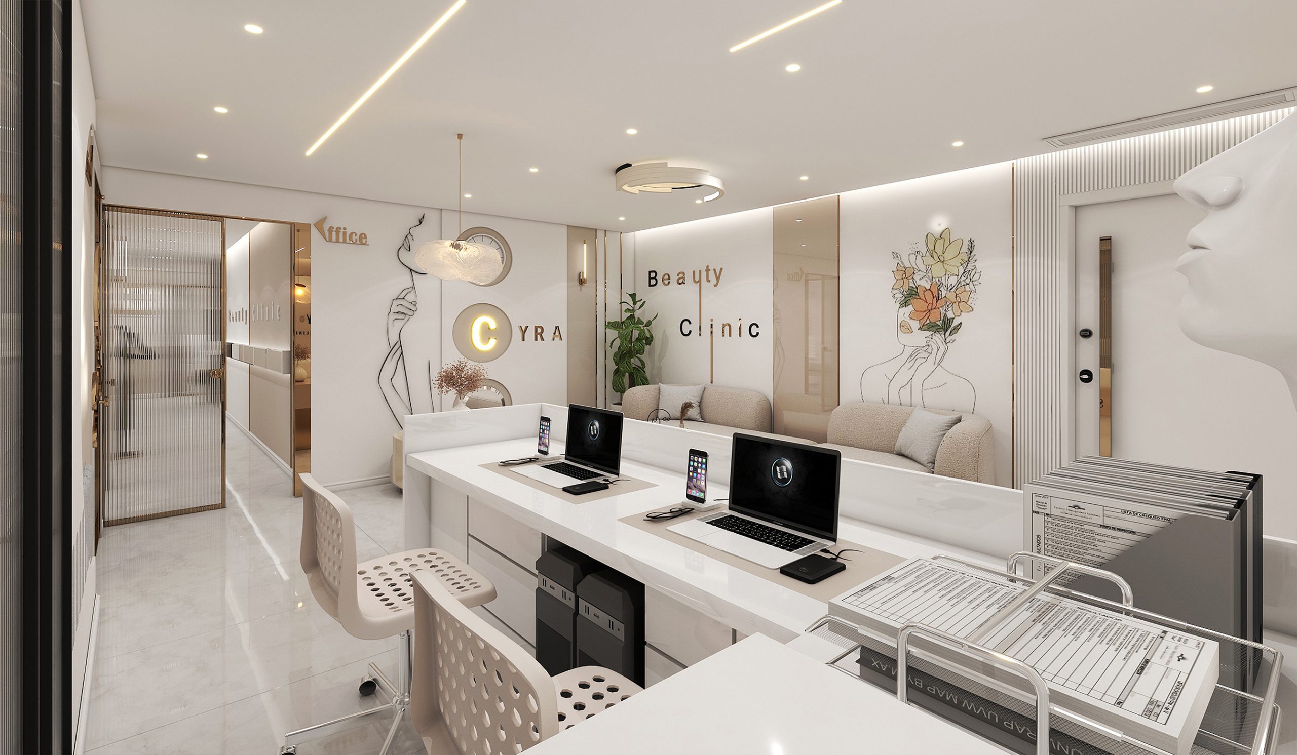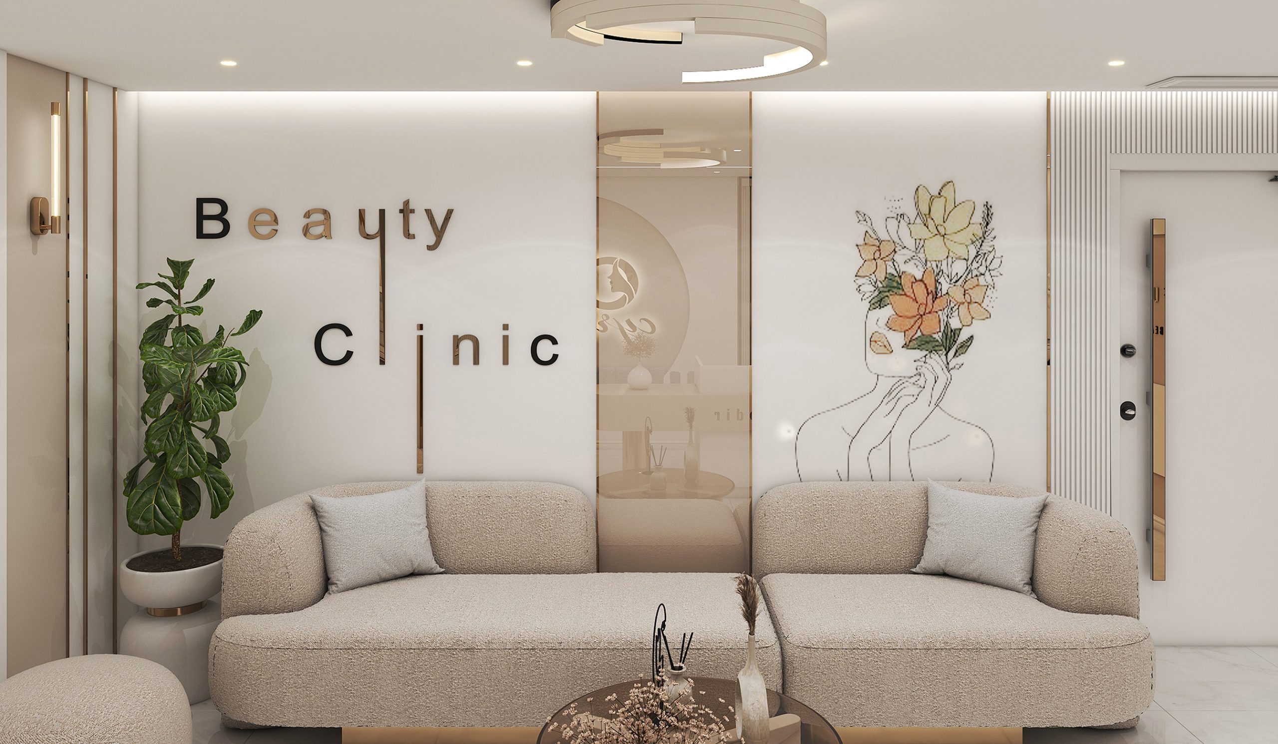 This image showcases the modern and stylish interior of a beauty clinic named CYRA Beauty Clinic. Its minimalist design, utilizing neutral colors and gold accents, creates a luxurious and welcoming atmosphere. Overall, this design is both luxurious, minimal, and inviting—perfectly suited for a beauty clinic.The interior design of this clinic, in terms of composition and choice of elements, is carefully crafted to evoke a sense of luxury, minimalism, and hospitality. Considering your design projects, this style can serve as great inspiration for reception areas, entrances to luxury salons, and cozy, relaxing sections Strategically placing the clinic’s name and logo enhances brand identity and conveys a professional impression to clients. Creating an inviting space: A combination of warm lighting, comfortable furniture, and soothing colors makes the environment pleasant and reassuring for visitors.