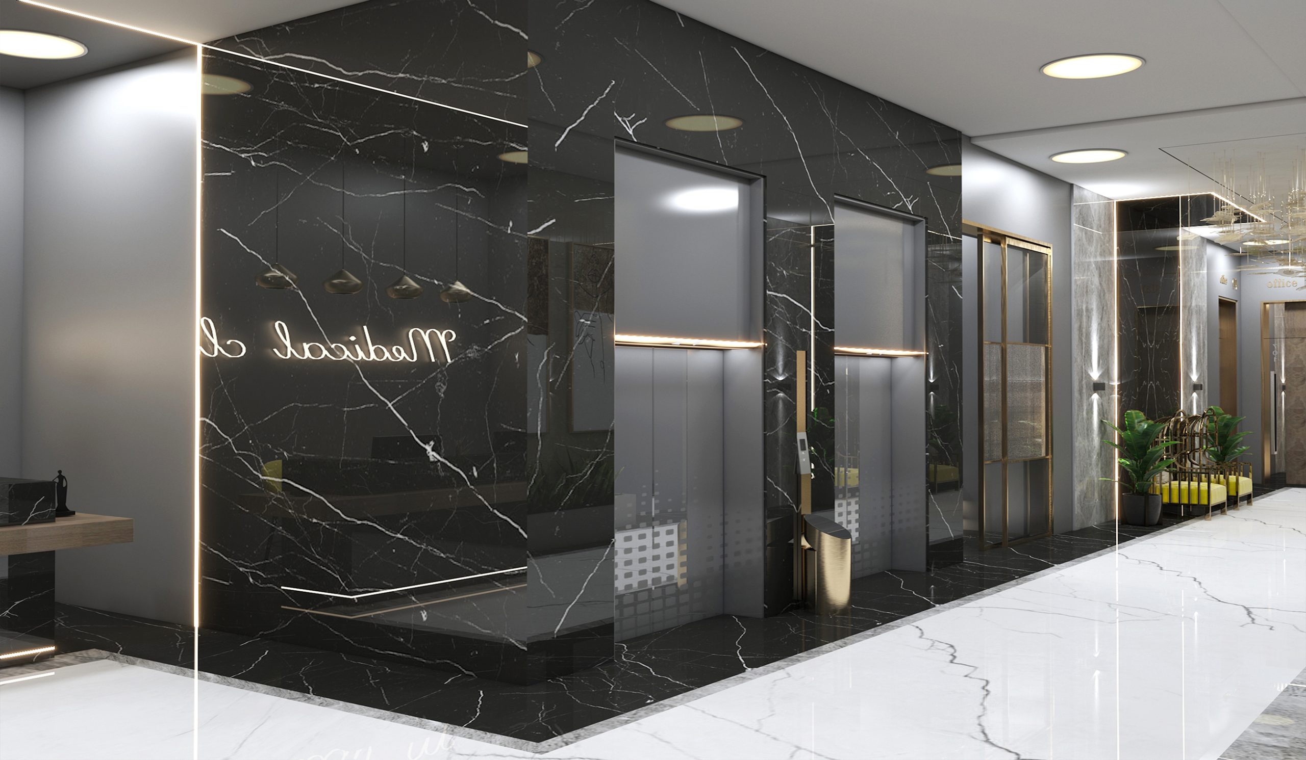 "Interior design of the clinic in a modern style with an area of 100 square meters.
