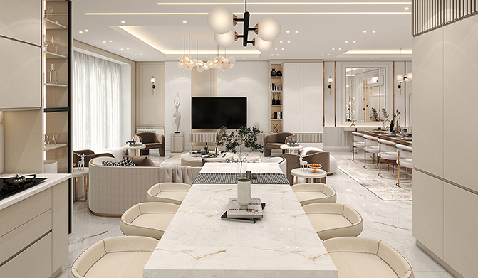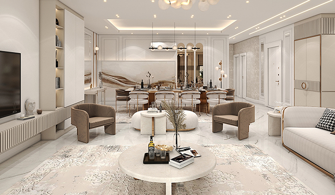 The interior design of a 160-square-meter modern living room and reception area