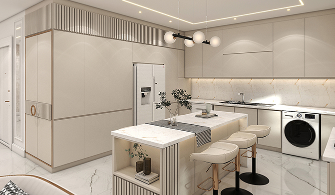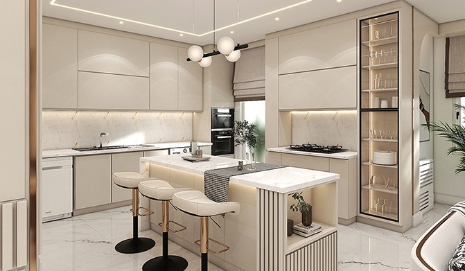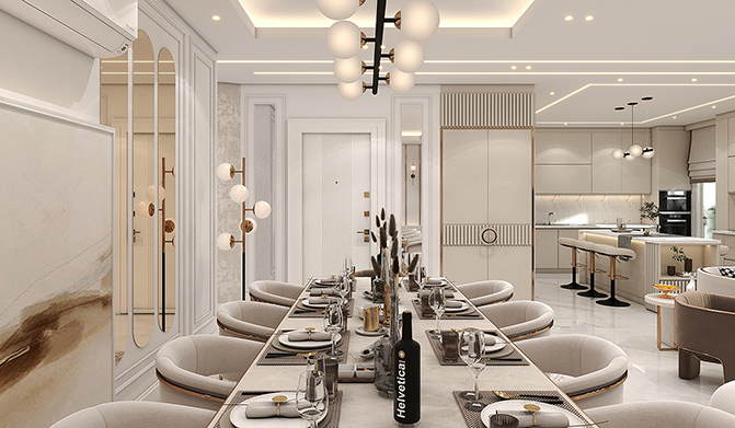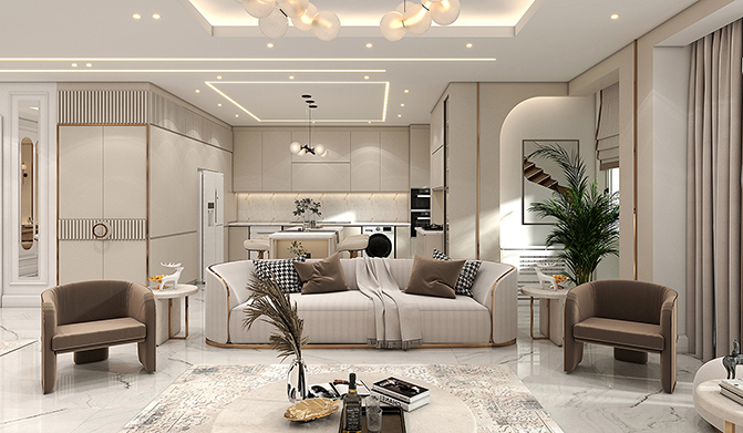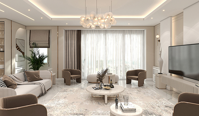 This design creates a modern and luxurious space, combining refined materials, precise lighting, and balanced arrangement to enhance warmth, comfort, and elegance in the environmentTwo comfortable armchairs placed near the television, complemented by small round tables, create visual balance and relaxation.A modern and minimalist design featuring decorative shelves and built-in cabinets, optimizing storage space efficiently.A unique modern chandelier, adding a distinctive touch to the ceiling and enhancing the overall ambiance.This design is perfectly aligned with the modern and minimalist style, delivering both comfort and grandeur simultaneously.