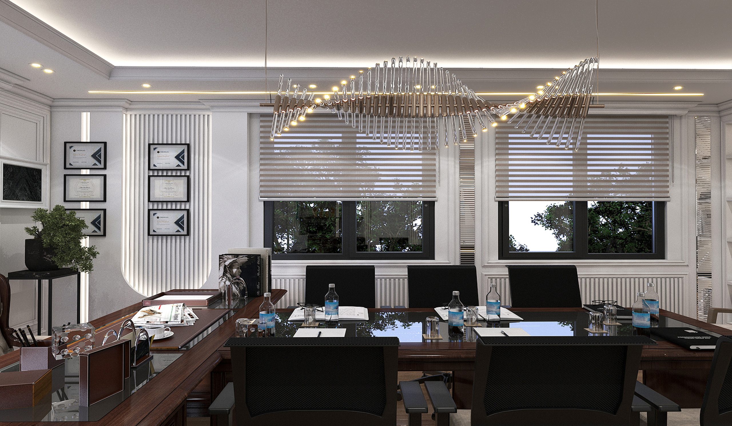 Overall, this meeting room is designed to be both formal and to convey a sense of creativity and luxury—ideal for design firms, architectural companies, or high-level executives. The ceiling and wall moldings are entirely classical, with wall cornices, door frames, and wall paneling inspired by classical style.Materials such as glossy black marble, clean lines, and minimalist furniture introduce a modern feel to the space. This combination makes the room both professional and serious, while remaining stylish and contemporary. Hidden lighting is used in the ceiling and walls, reinforcing the luxurious and modern ambiance.The central chandelier features a highly artistic and modern design, with a spiral structure and metallic materials, making it the focal point of the ceiling