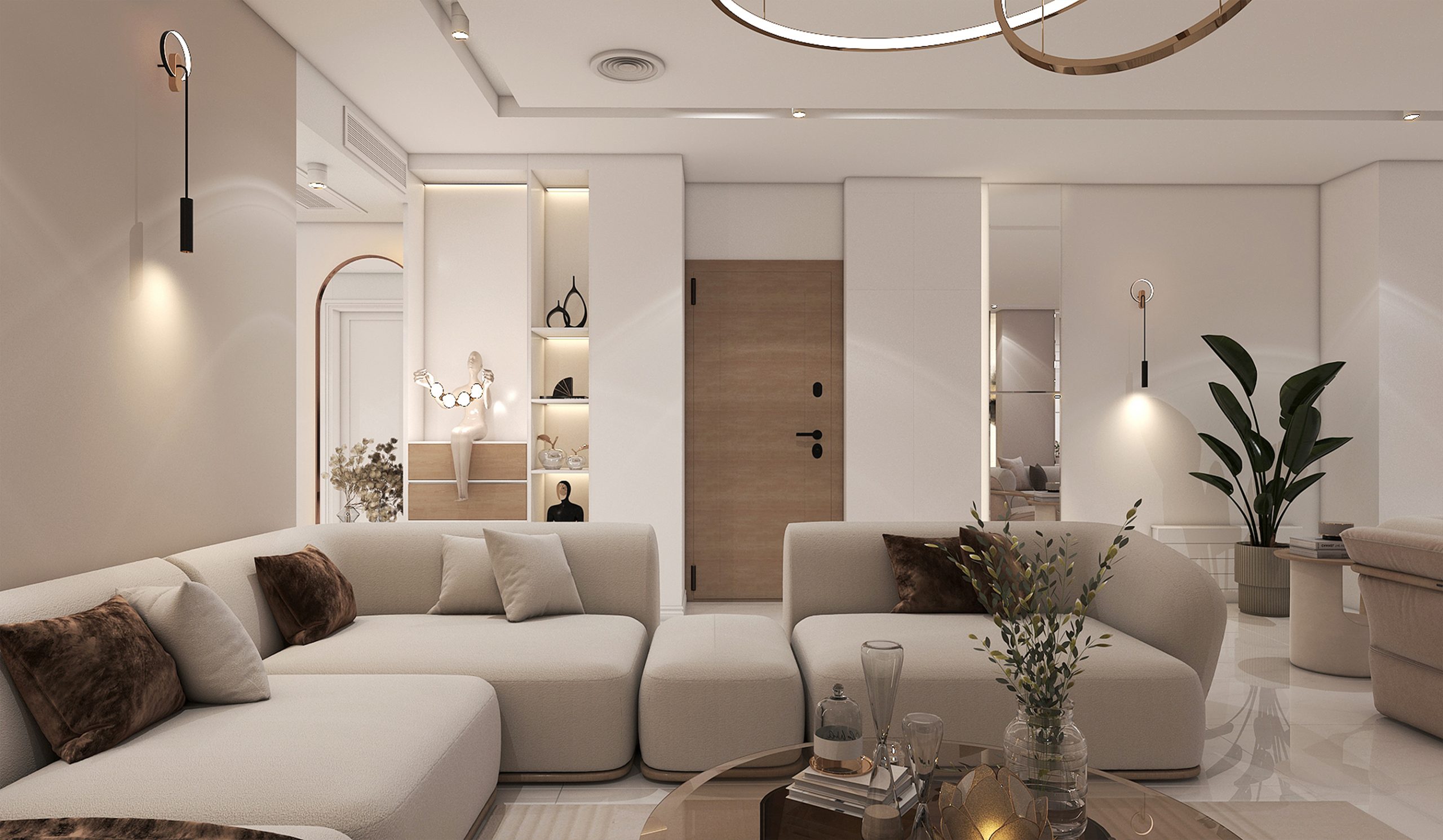 This image showcases a modern and stylish living space. The design is based on principles of harmony and functionality. Hidden ceiling lighting and accent lights highlighting artwork and wall-mounted shelves create a pleasant ambiance. This type of lighting adds depth and softness to the environment. The design style carefully balances details and material coordination to maintain both beauty and comfort. The combination of neutral colors such as beige, cream, and brown creates a serene and luxurious atmosphere, ideal for relaxation and social interaction.