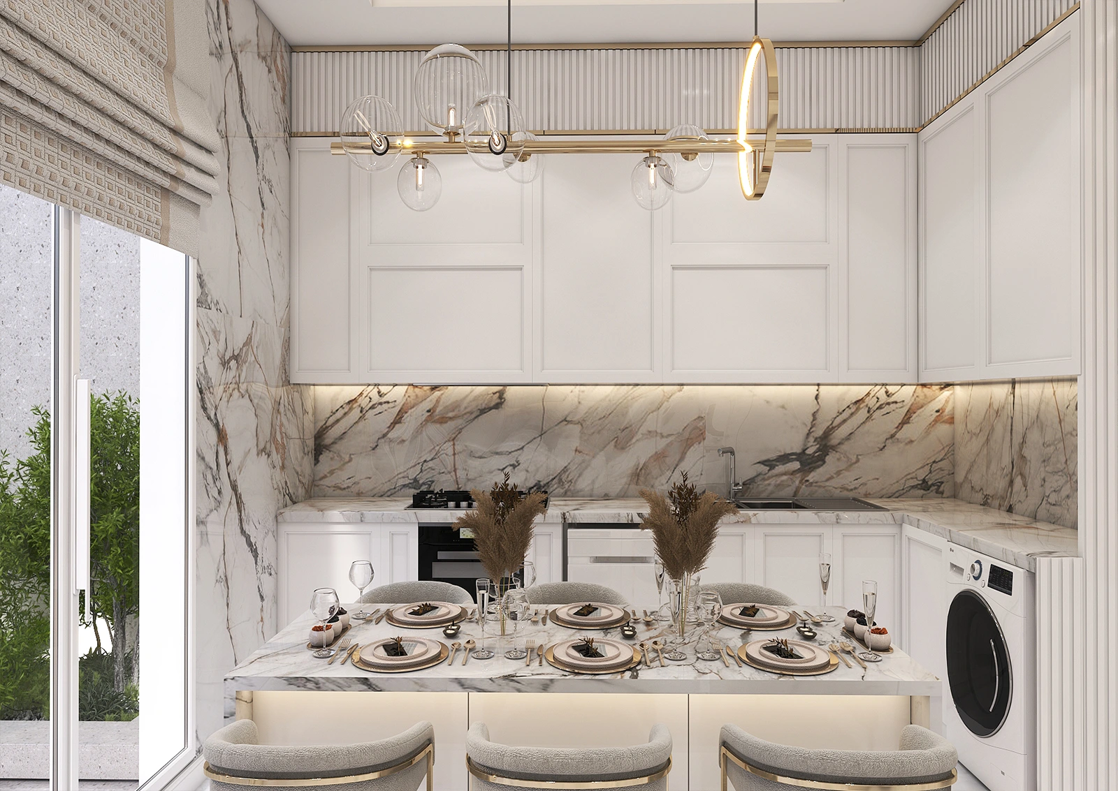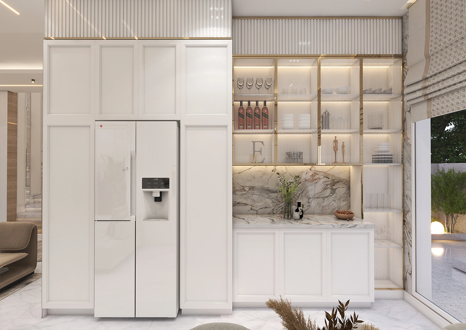On a quiet afternoon, sunlight streams in through the large window and dances across the white marble surface of the kitchen. The glossy white cabinets stand side by side like silent walls, their clean, orderly lines giving the space a sense of order and cleanliness.