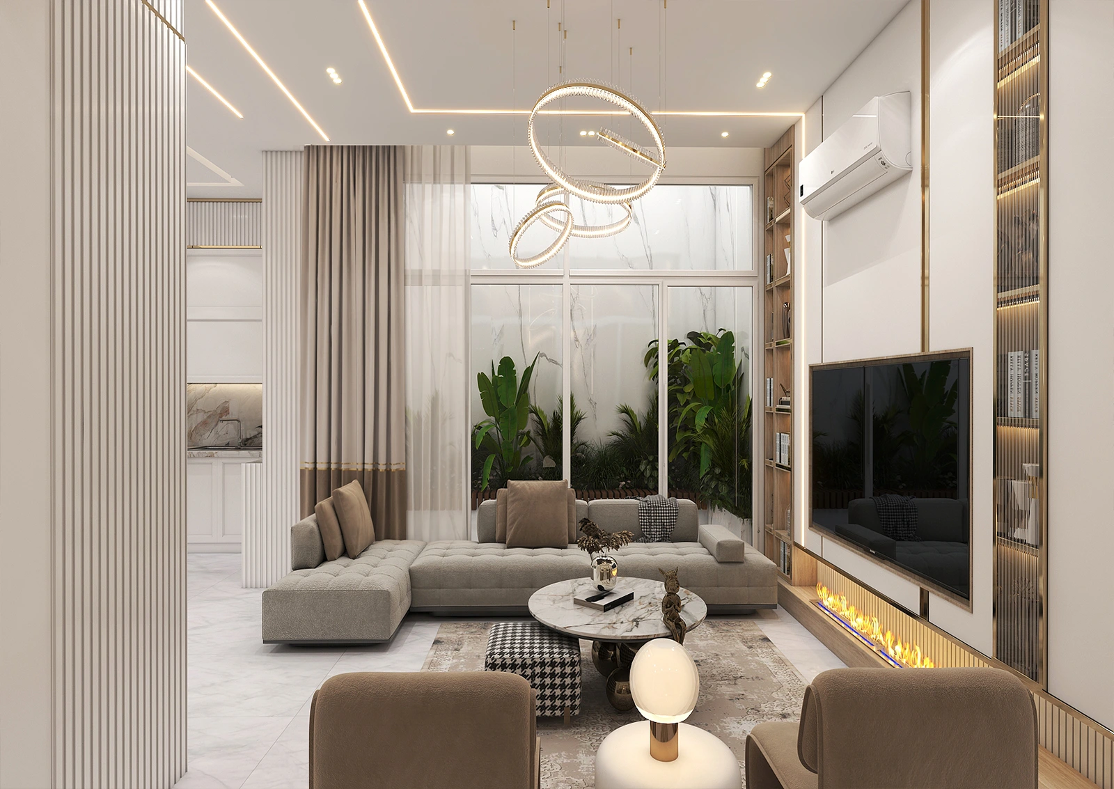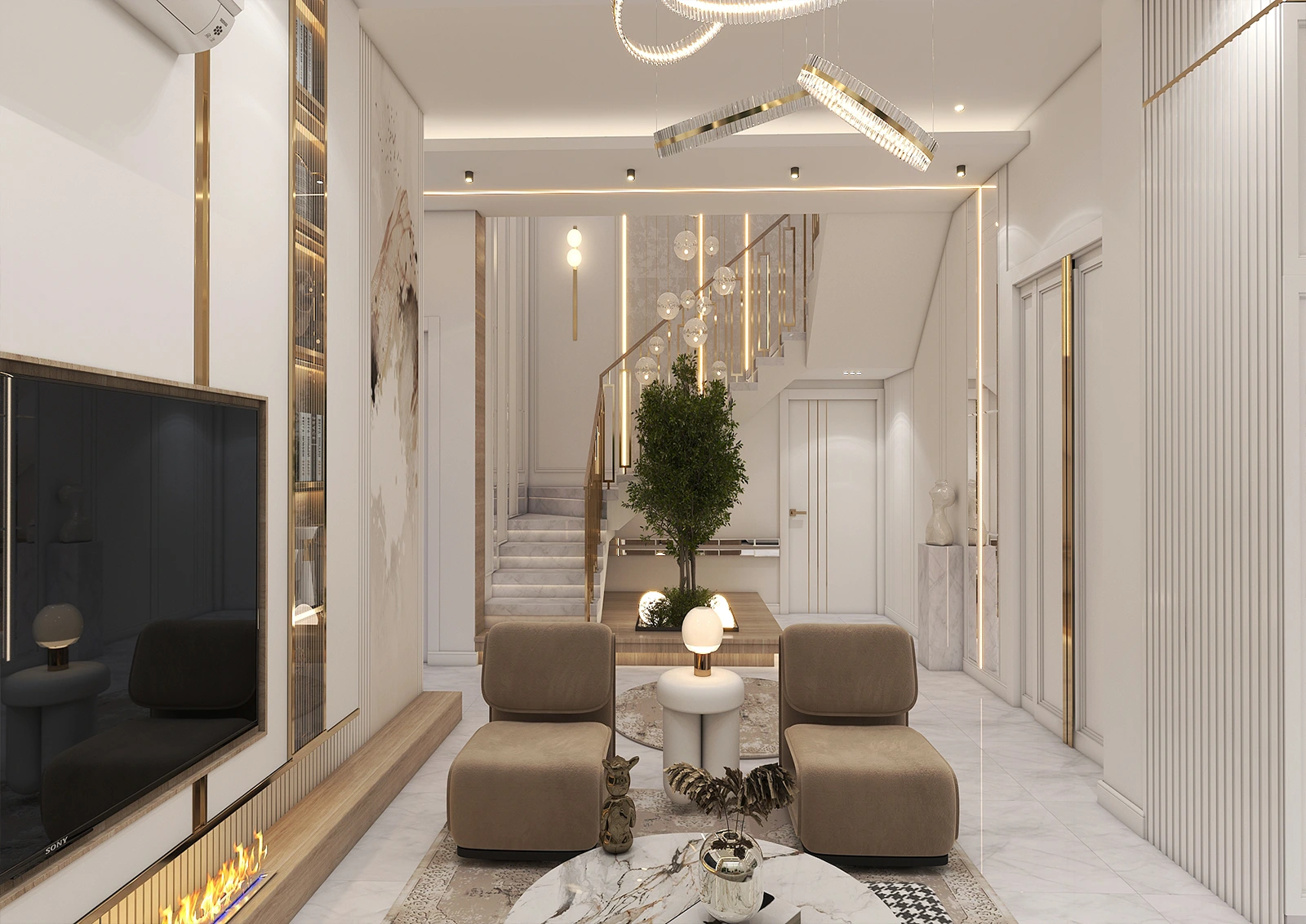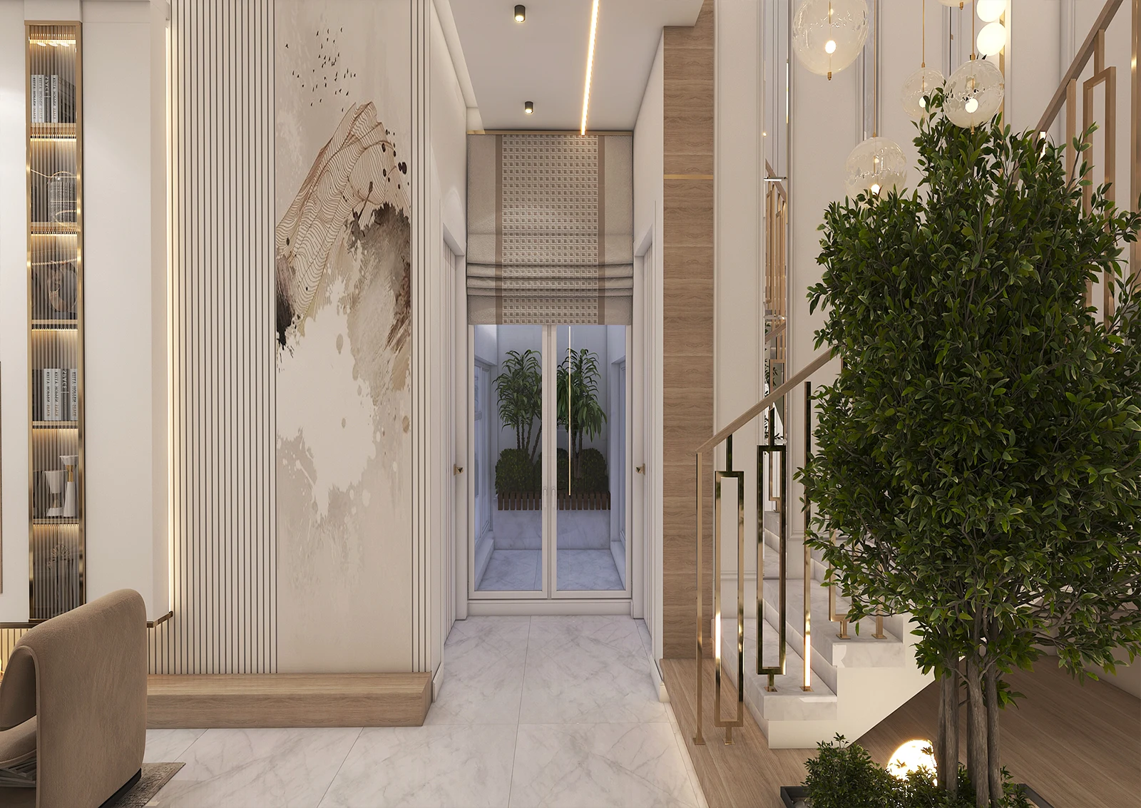 Everything in this design, from the choice of neutral colors to the golden details, from the thoughtful lighting to the combination of art and nature, is harmonious, making the home not just a place to live, but a stage for experiencing beauty and tranquility.