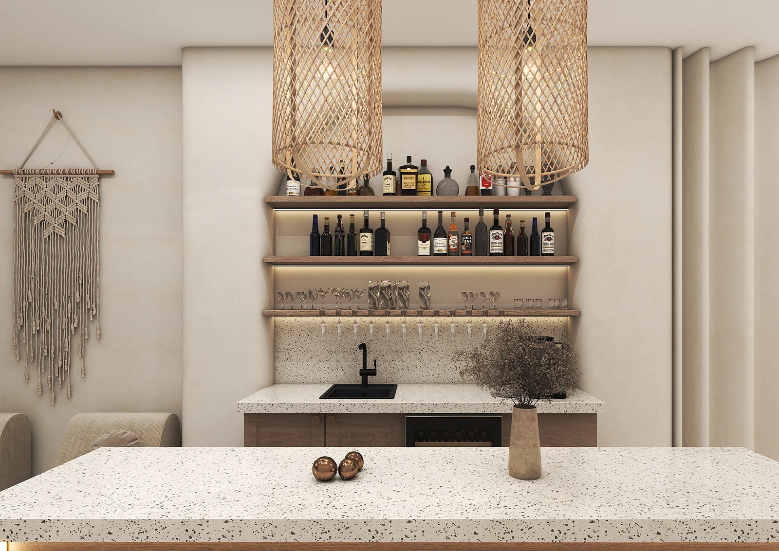 The combination of terrazzo and natural wood tells a story of the earth and the human hand. With its mottled texture, terrazzo recalls the feel of soil and stone, while wood, with its natural warmth, keeps the spirit of the space alive. These materials are not only beautiful, but with their touch, they convey a sense of life, as if the house itself were alive.