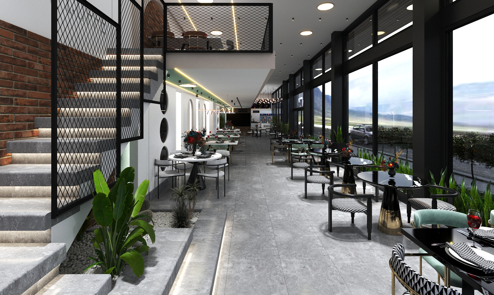 The entrance of this restaurant is designed in an intelligent and inviting manner, instantly conveying a sense of modernity, elegance, and warmth. It is marked by several light gray stone steps, enhanced with hidden lighting beneath them, creating a unique and luxurious effect. This elevation difference gives the feeling of transitioning from the outdoor space into a distinct and exceptional environment.