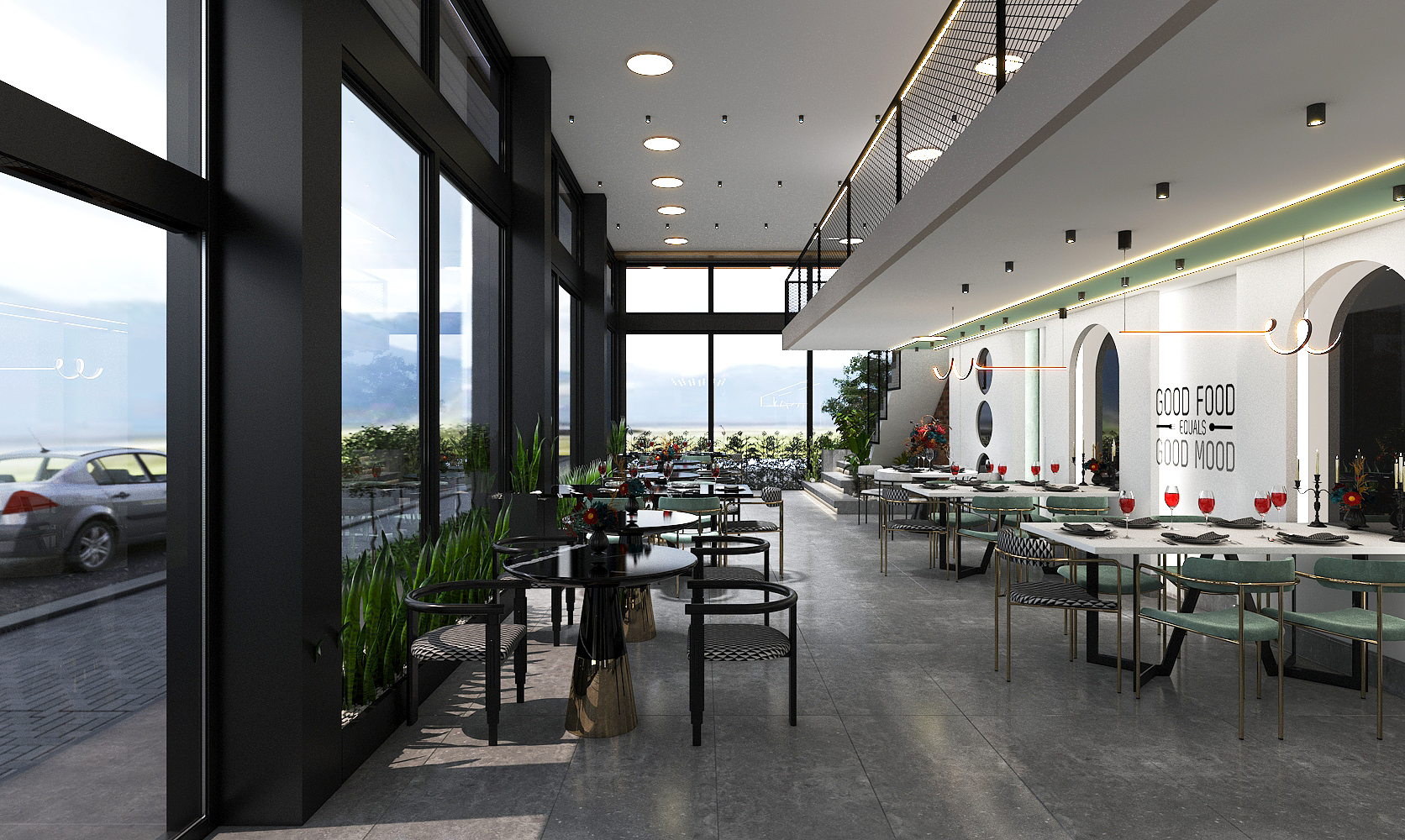 Modern-style restaurant design with an area of 220 square meters."