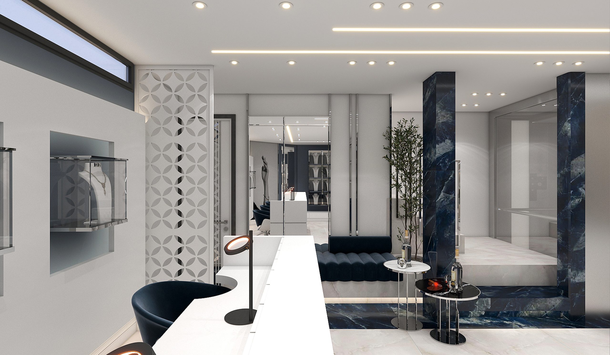 The interior design of Mr. Sadeghzad’s jewelry store follows a modern style, covering an area of 150 square meters