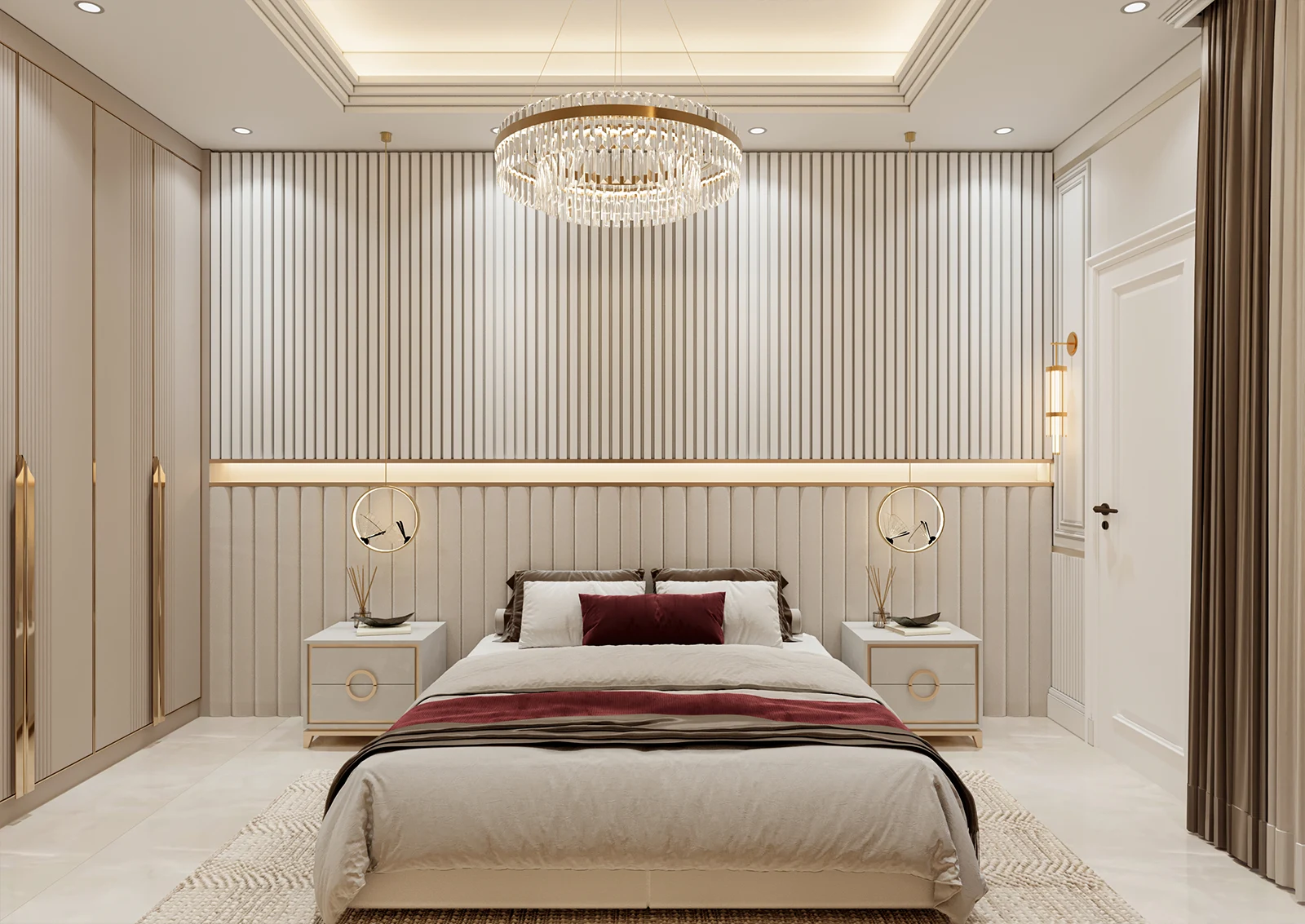 طراحی اتاق خواب با متریال - ام دی اف -لمسه - نورخطی- نواراستیل طلایی - ام دی اف شیاردار-