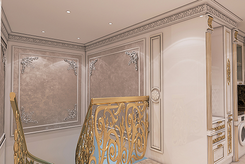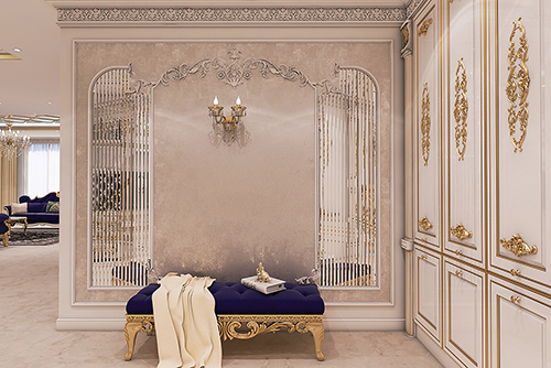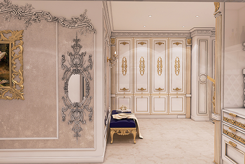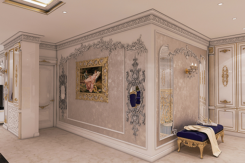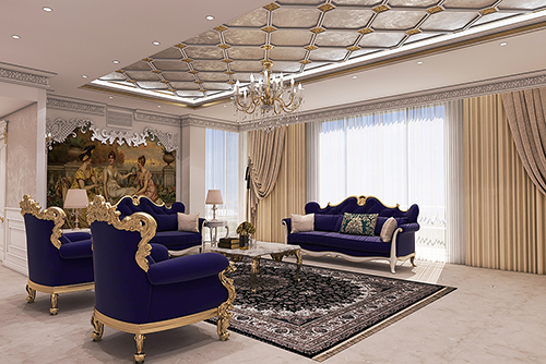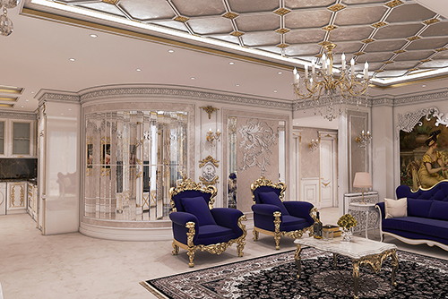 طراحی داخلی سالن پذیرایی و آشپزخانه به سبک کلاسیک متراژ کلی ۵۳۰ مترمربع