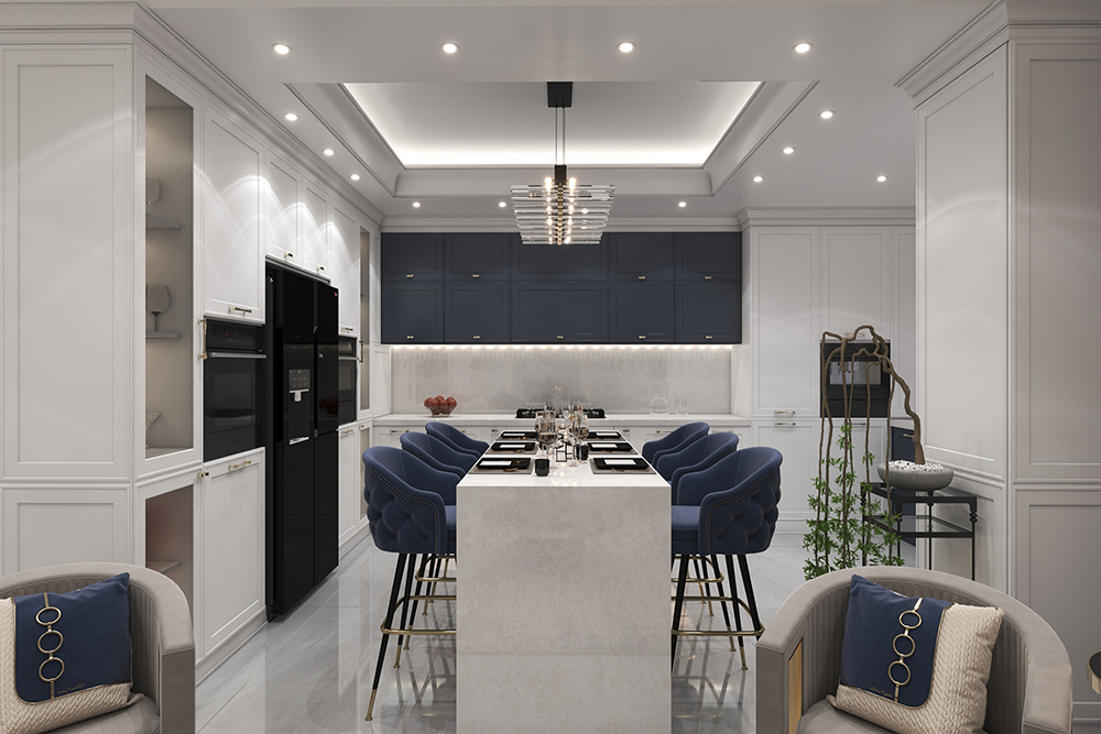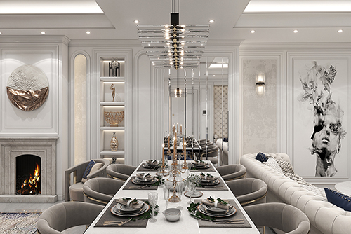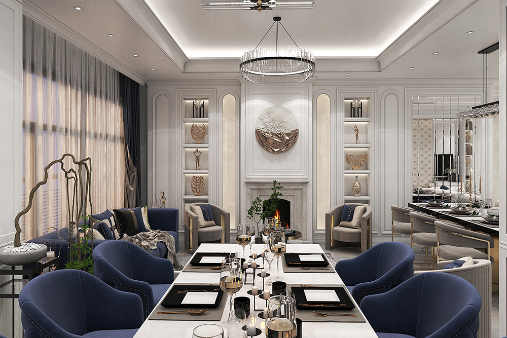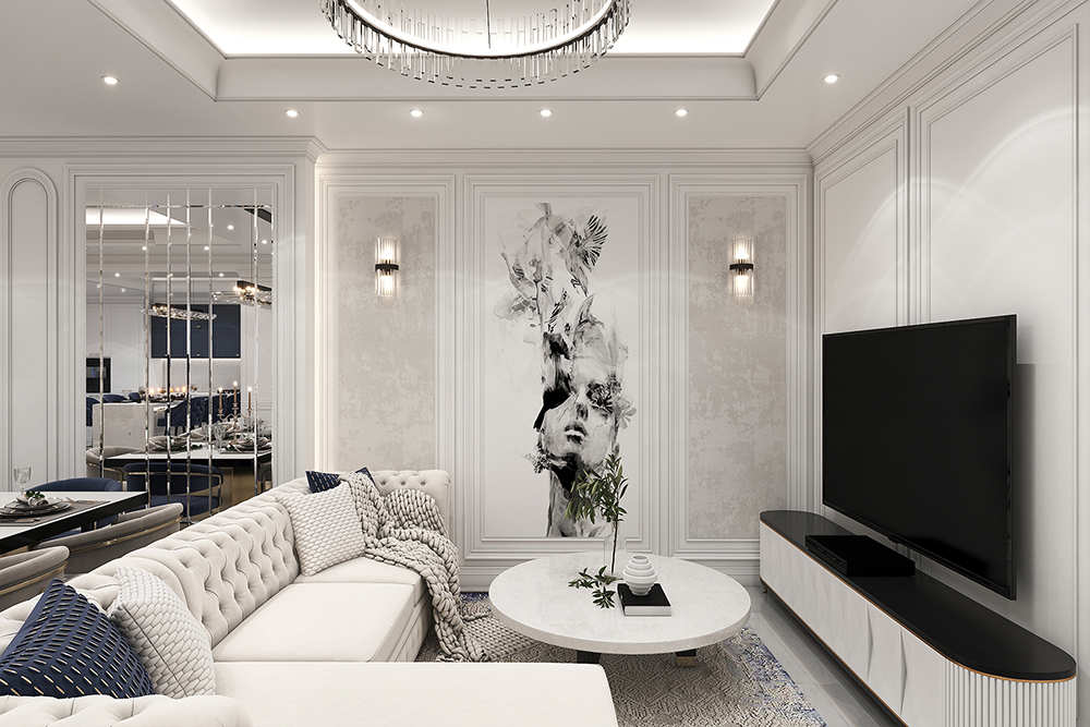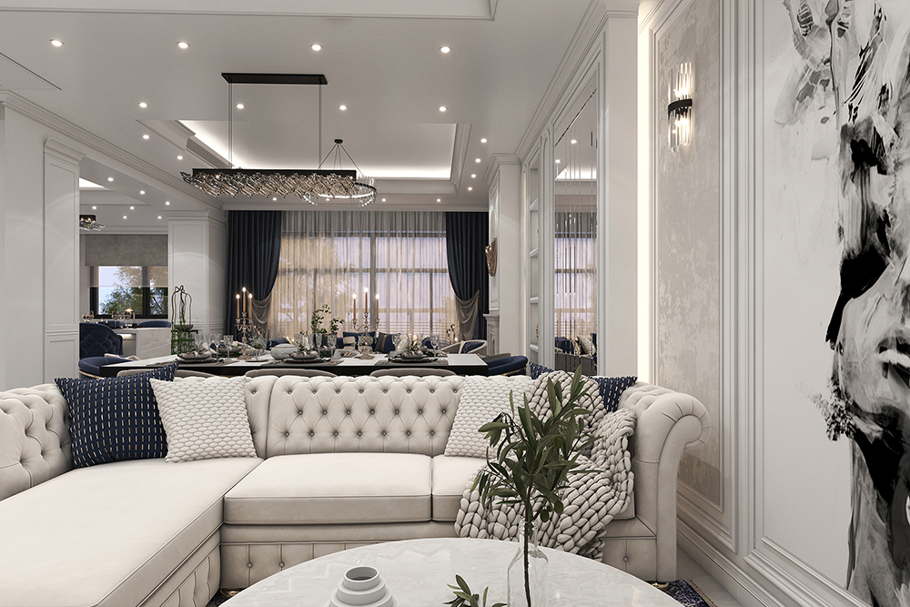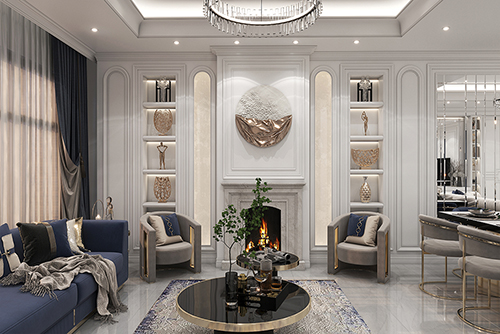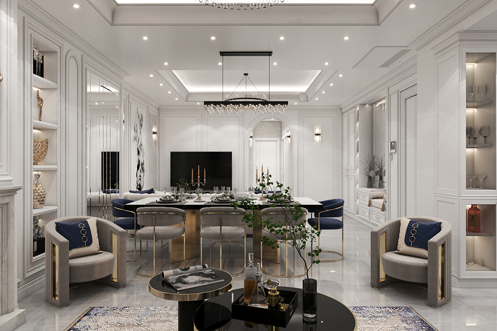 طراحی سالن پذیرایی  به سبک نئو کلاسیک به متراژ ۴۱۰ مترمربع