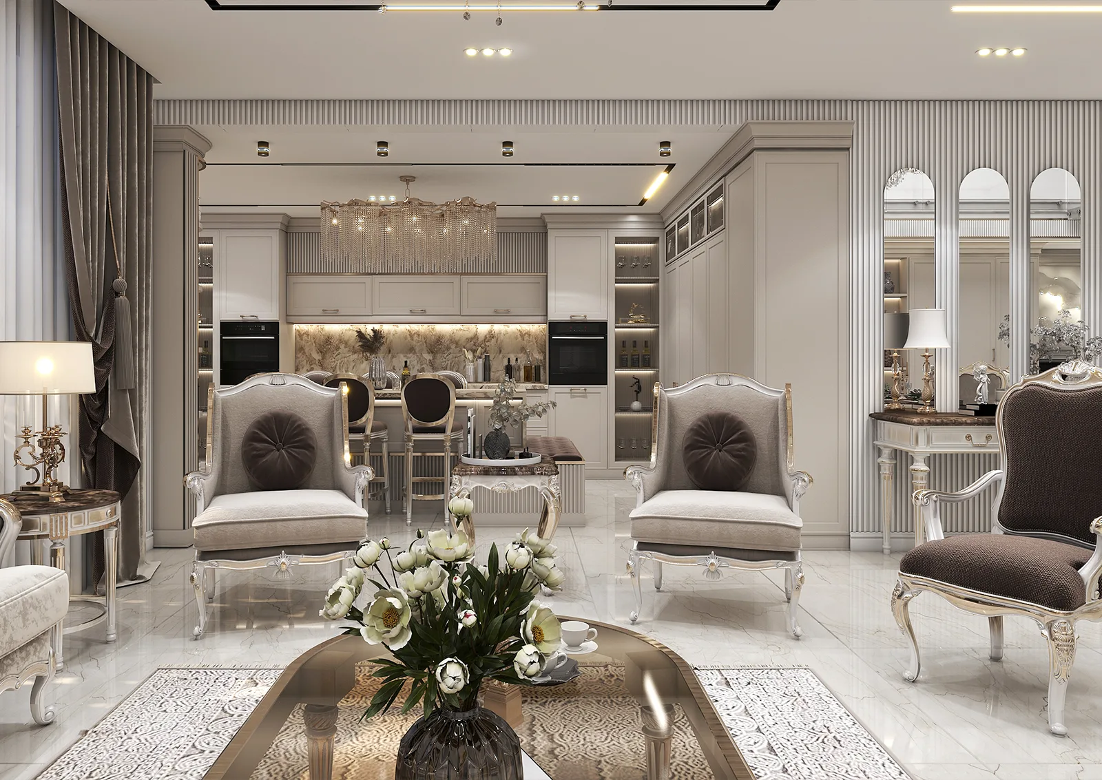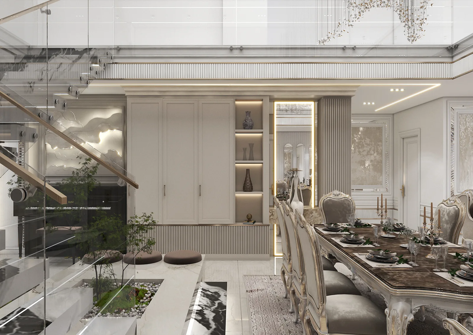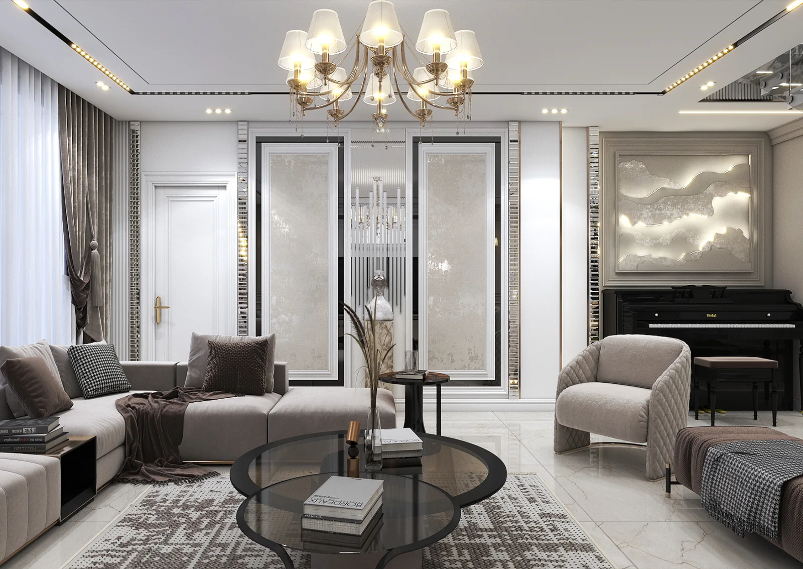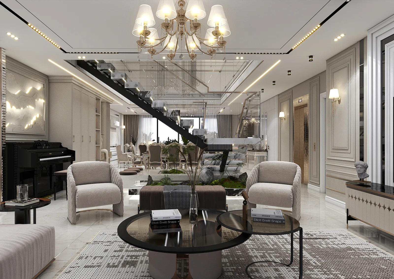 خانه » Portfolios » بازسازی ساختمان » طراحی سالن پذیرایی پروژه مسکونی دوبلکس ۵۶۰ متری آقای استوار